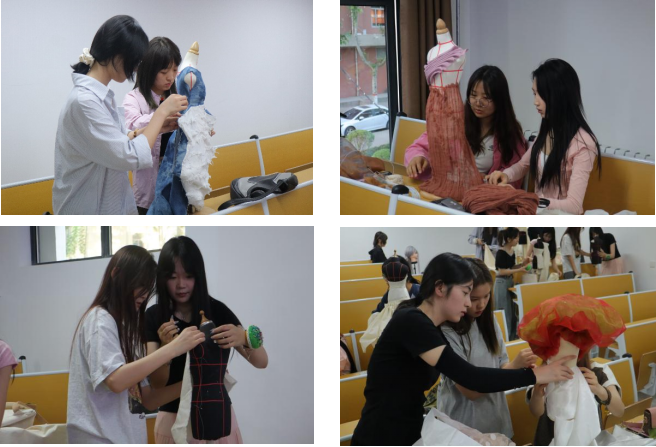 4月25日下午18:30,比赛在金花校区1-103教室举行。比赛现场气氛热烈,同学们热情高涨,纷纷拿出自己的看家本领,在规定时间内完成了与主题相关的立裁创作。本次比赛要求同学们自备人台、布料,并明确规定了不得使用电子产品参考的规则,以确保比赛的公平性和真实性。比赛限时1小时完成作品,同学们争分夺秒,充分发挥自己的创意和专业技能,创作出了一件件别出心裁的立裁作品。