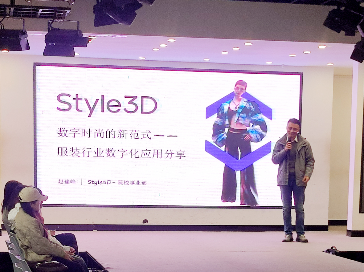服工系在服装楼一楼表演厅举行了主题为《Style3D数智时尚的新范式-服装行业数字化应用分享》的讲座,讲座由服装工程系副主任吴龙主持。讲座邀请了浙江凌迪数字科技有限公司院校事业部副总经理赵建峰作为报告人,赵建峰是一位资深院校项目专家、高校教师、高级技师和国家职业技能鉴定考评员,拥有多年从事服装专业建设服务工作的丰富经验。