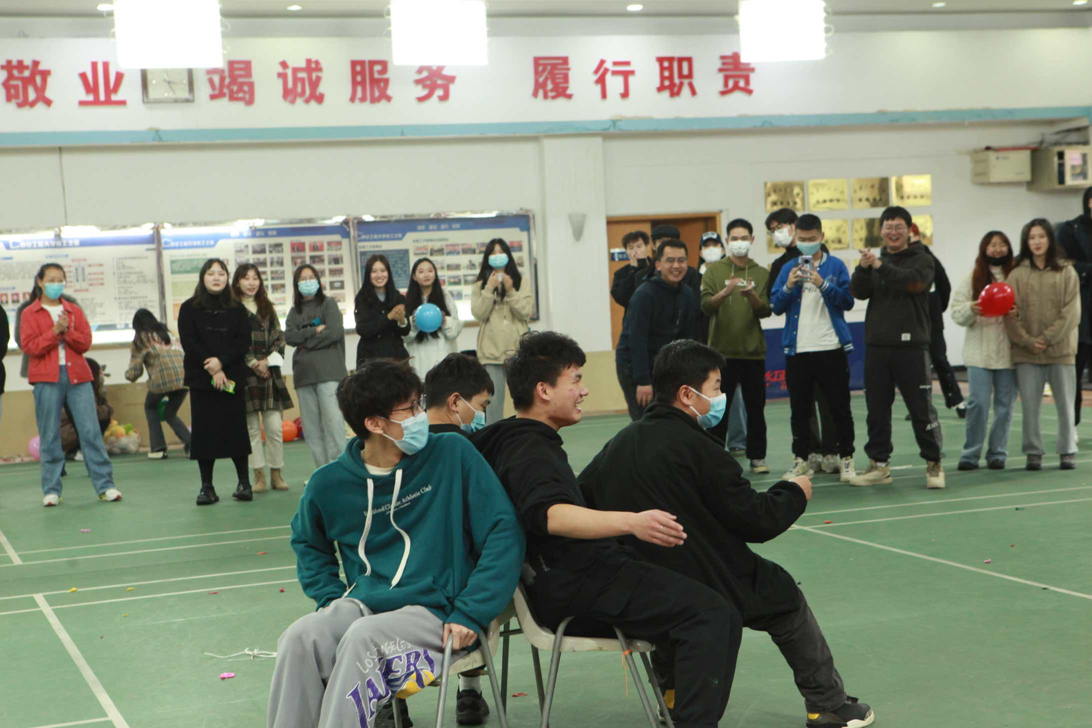 党委副书记郭欣欣、学工办主任蔡洋、20级辅导员王盼、21级辅导员刘文奇参与,共设置两人三足、踩气球、你比我猜、拖乒乓球比赛、螃蟹折返跑、抢凳子和听歌识曲七项比赛项目。