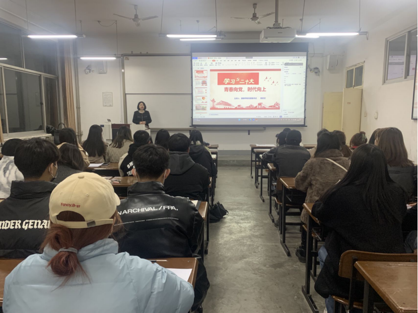 会议首先由郭欣欣以“青春向党,时代向上”为主题给党员同志们讲党课。郭书记先是阐述了党的二十大主题以及意义。随后介绍了党的百年历程,经历了开天辟地、改天换地、翻天覆地的三个阶段。接着讲解了中国特色社会主义进入新时代站起来、富起来、强起来所取得的重大成就,引导同学们思考自己的“中国梦”是什么以及如何认识个人梦与中国梦的关系,最后还给党员们提出了“细读一本红色绘本,参观一个红色基地,会唱一首红色歌曲,会讲一个红色故事”红色青年要求。