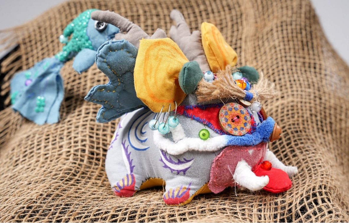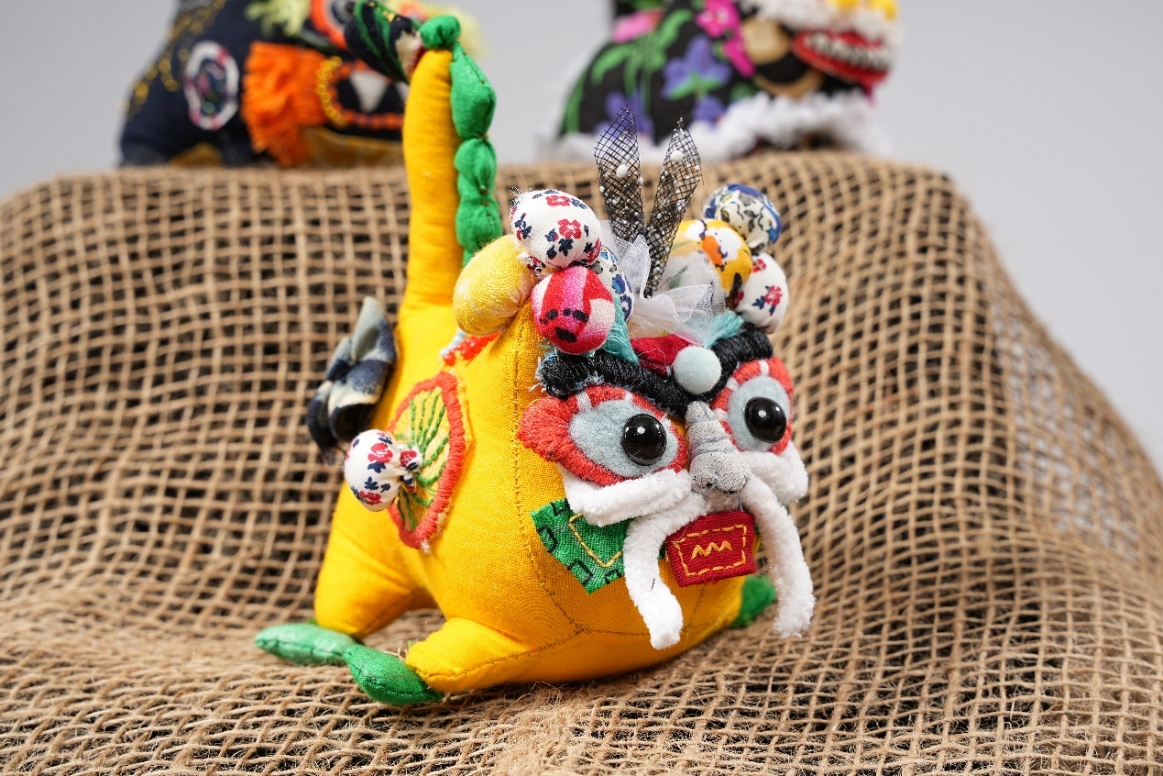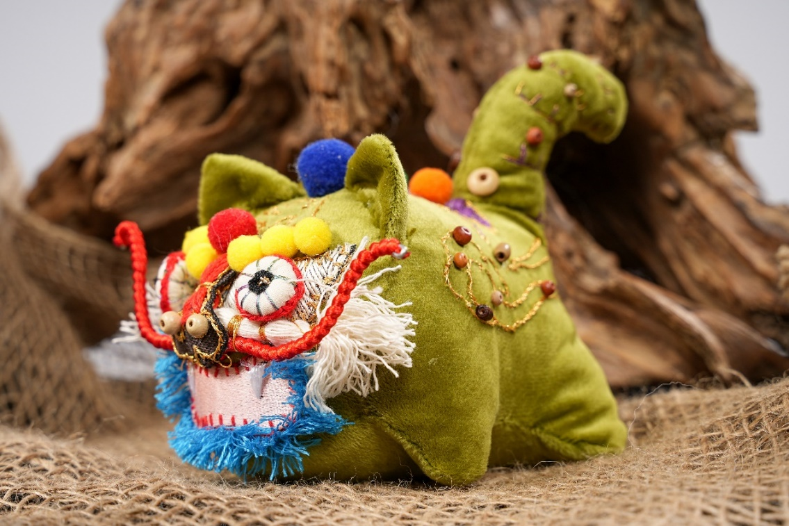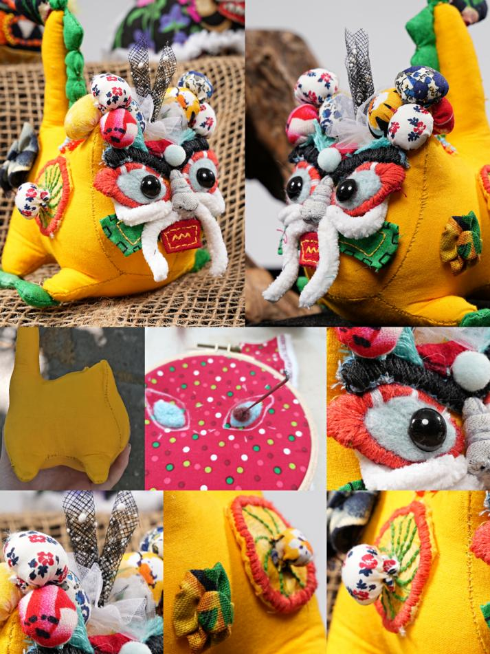 作品说明:以“艾虎”为基础发散思维,制作同形状不同模样。使用剪、绣、贴、系、补、叠等技术结合设计,对材料进行改造重组为小龙。作品头身戴有花草药包,具有除虫的作用,花草药包五彩的颜色也是快乐幸福的代表;身体珠串具有辟邪驱邪的作用;白胡子黑眉毛是知识长和健壮的代表。大家一起虎虎生威,虎虎升龙。
