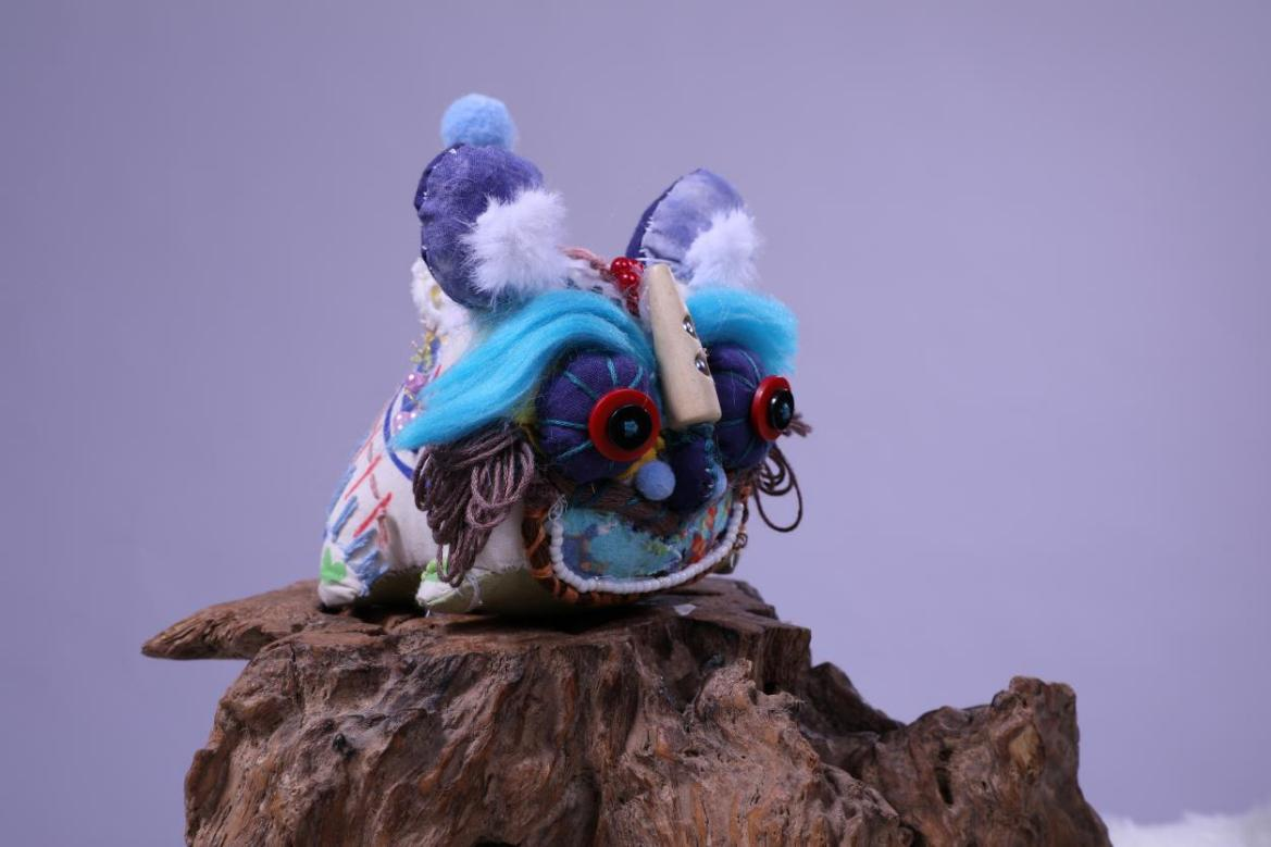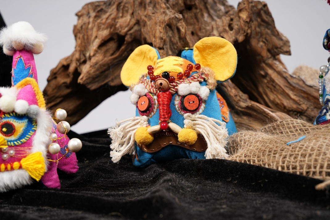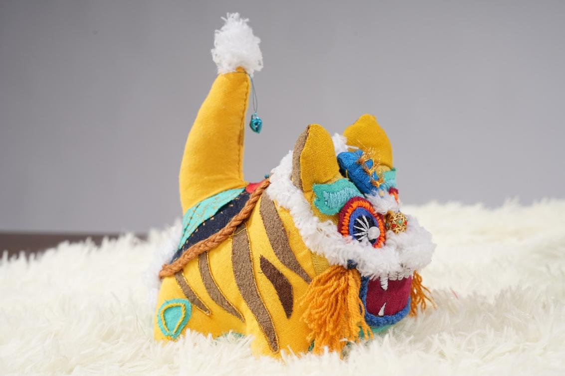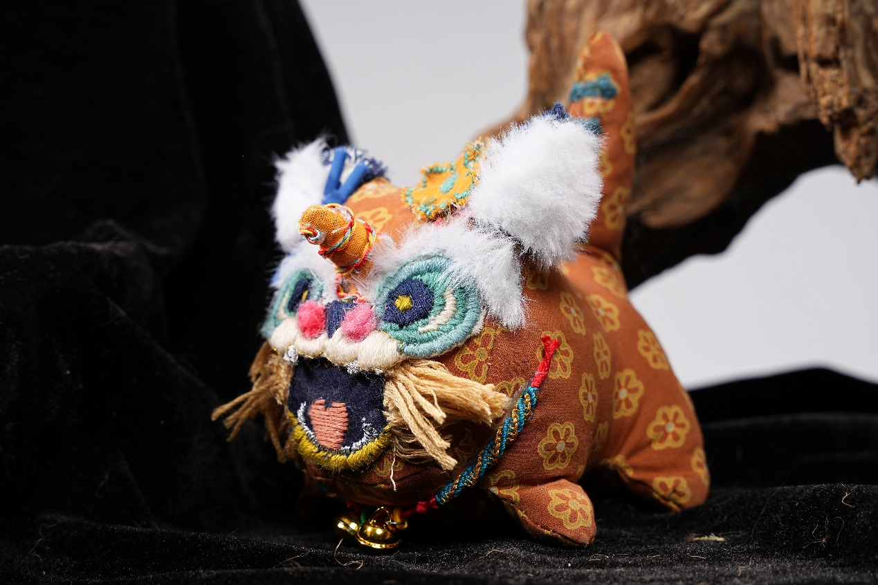 作品说明:艾虎是中国传统文化的一种象征,以此为主题,进行了构思发想。以其“硕大的耳朵”为亮点吸睛,似于“招风耳”,也寓意着希望好运连绵。主体色彩采用亮眼的颜色,使得招风虎显得童趣盎然。在面料选取上,老虎的身体采用偏粗麻的手感,使其充满质感。在五官选定时,经多次调整最后达到理想的效果。额头上的红玛瑙珠子与木质铃铛,撞色珠子鞍,以及尾巴的铜钱装饰等作为细节之处,使得它更加丰富特别。新时代的发展使得艾虎形象变得更为多元化发展,招风虎便是此背景下的一种个性体现。
