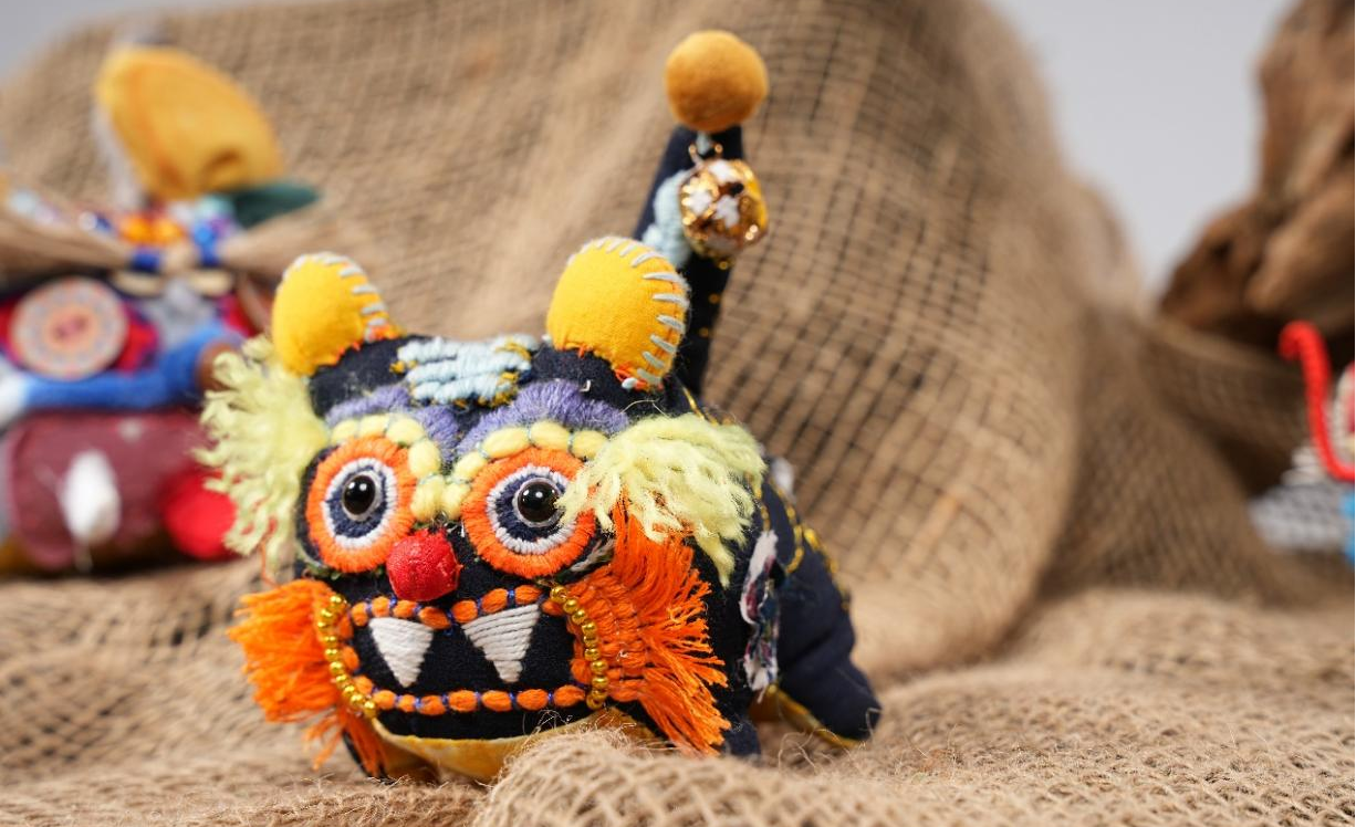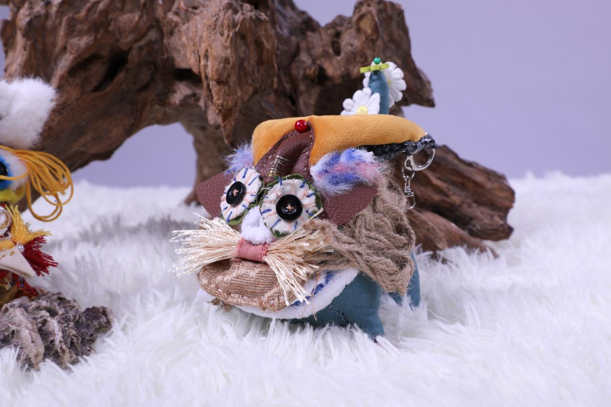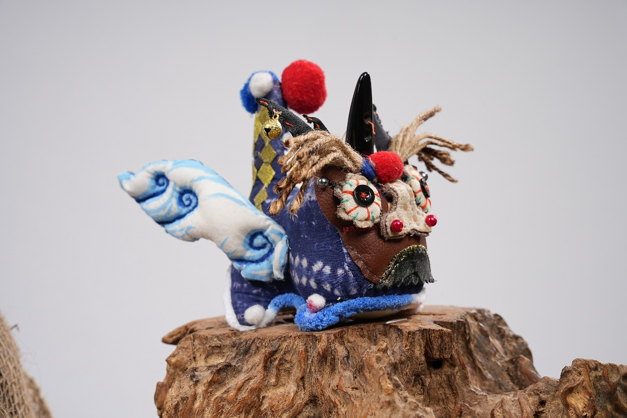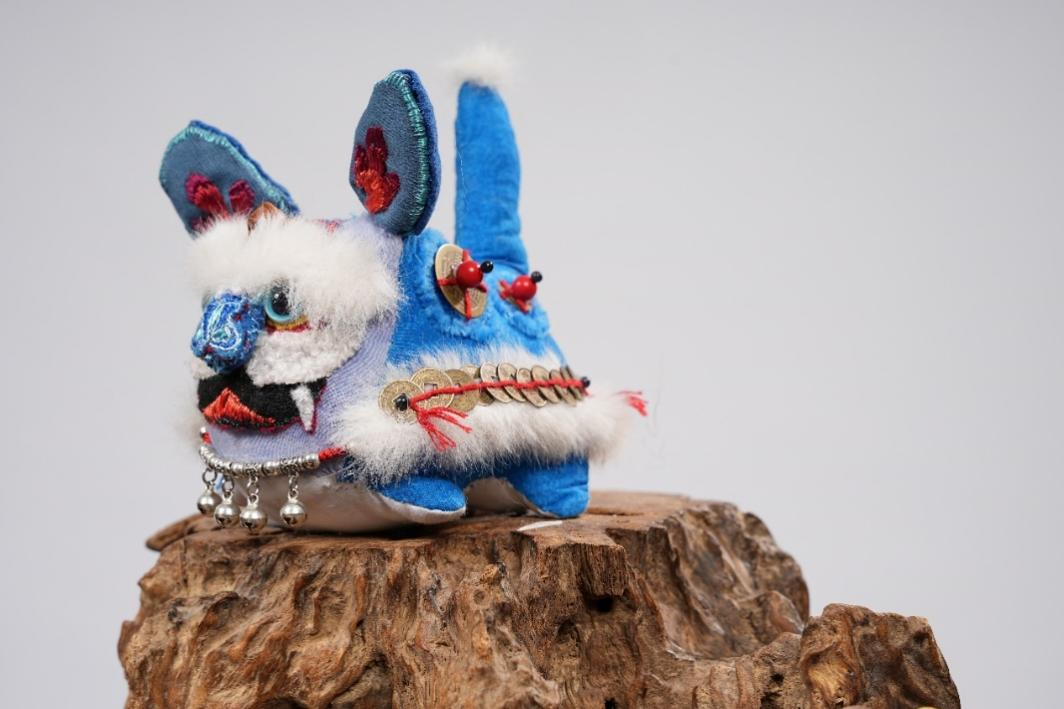 作品说明:艾虎是中国传统文化的一种象征,以此为主题,进行了构思发想。以其“硕大的耳朵”为亮点吸睛,似于“招风耳”,也寓意着希望好运连绵。主体色彩采用亮眼的颜色,使得招风虎显得童趣盎然。在面料选取上,老虎的身体采用偏粗麻的手感,使其充满质感。在五官选定时,经多次调整最后达到理想的效果。额头上的红玛瑙珠子与木质铃铛,撞色珠子鞍,以及尾巴的铜钱装饰等作为细节之处,使得它更加丰富特别。新时代的发展使得艾虎形象变得更为多元化发展,招风虎便是此背景下的一种个性体现。