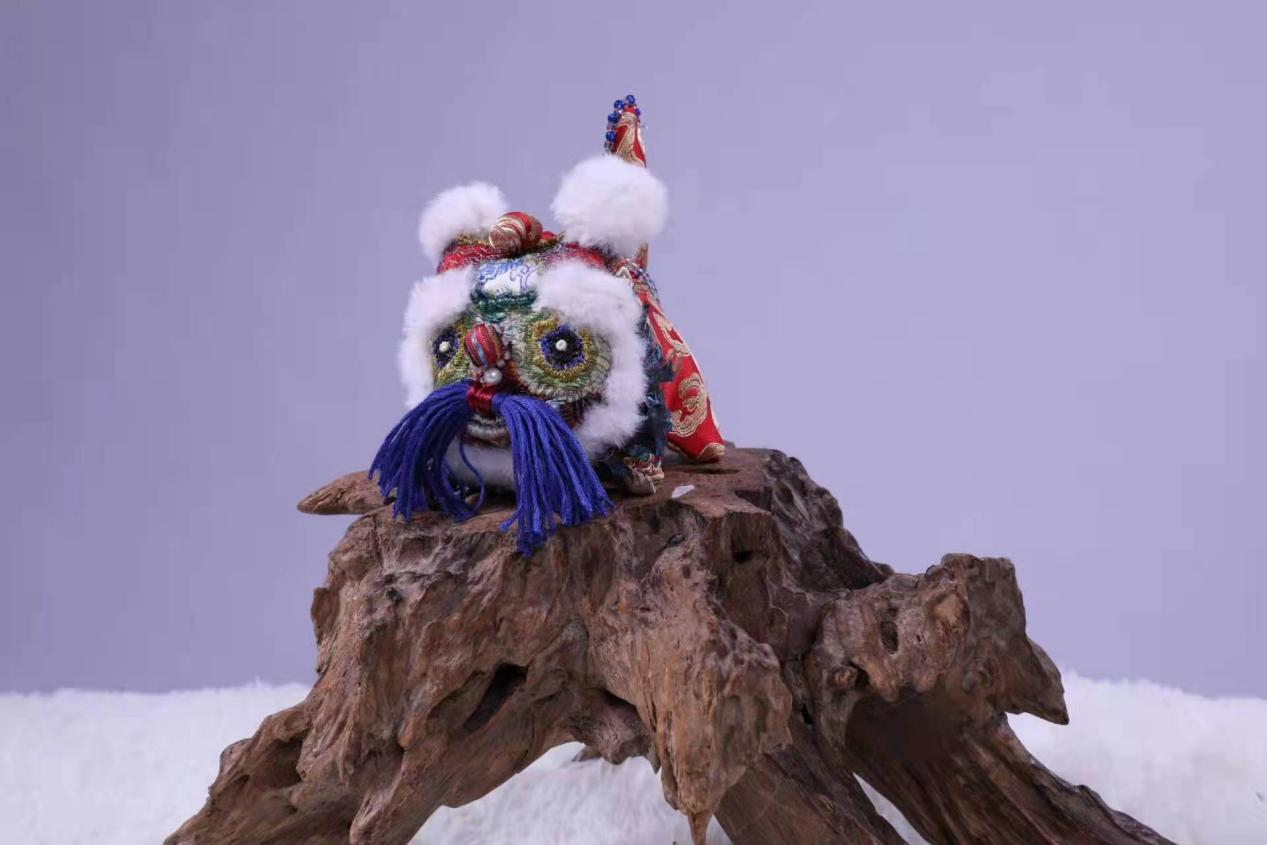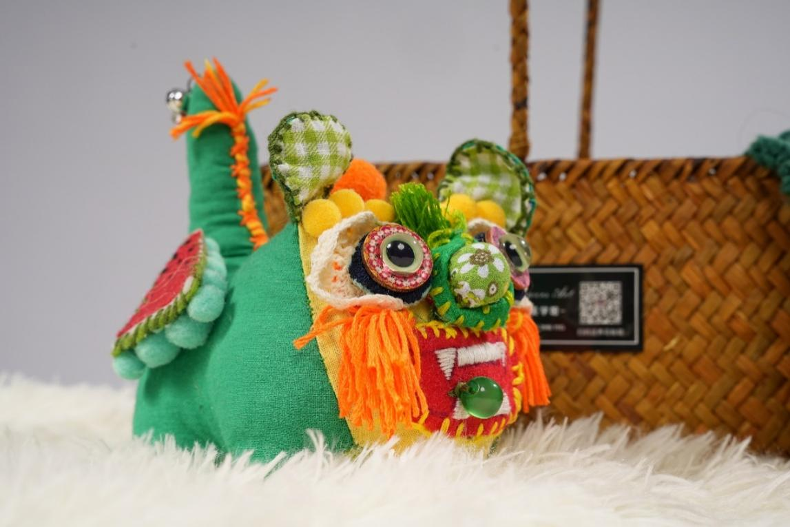 作品说明:虎在中国传统文化里是勇猛的、威武的瑞兽,象征的是智慧、勇气、吉祥和力量。艾虎,作为中国非物质文化遗产,不仅仅是传承一项传统手艺,更是体现民俗文化,在艾虎的基础上加以创新,融入现代元素,以绿色为主色调,加以刺绣的技法,眼睛是南瓜眼,立体的南瓜眼型,寓意招财进宝,塑造艾巴虎活泼的形象。虎头顶以金丝线勾勒“蝙蝠”纹饰,即谐音“福”,寓意是好运和幸福的象征。