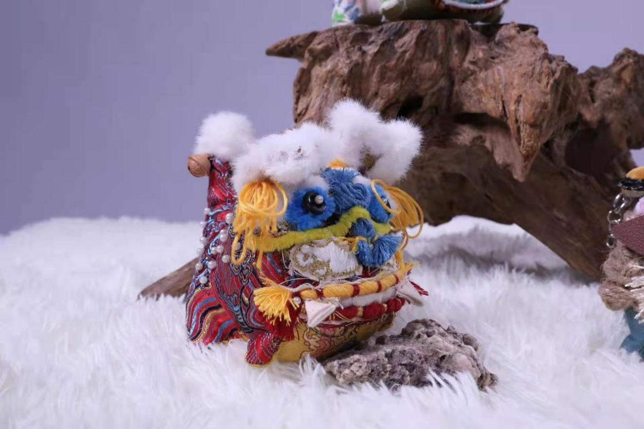 以狮子表演时有的神态为原型,加入特色的红色文化元素,搭配现代复古明亮的传统色彩,体现狮舞流传历史悠久的粗矿。红色小醒狮的眉毛胡子小耳朵上,都带有白色的绒毛,给原本威猛的醒狮布偶,增加了一种毛茸茸的温柔之感~小狮子的身上是用木质铜钱点缀的特殊纹样,后增加蓝色祥云纹样,寓意着美好、祥瑞和幸福。圆圆鼓鼓的小鞋子,让你一下子就抓住在手里,不让这个小萌兽逃出你的手掌心。