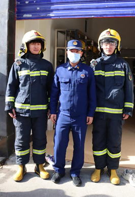 (师生与消防宣传员在消防安全教育基地门前合影留念)