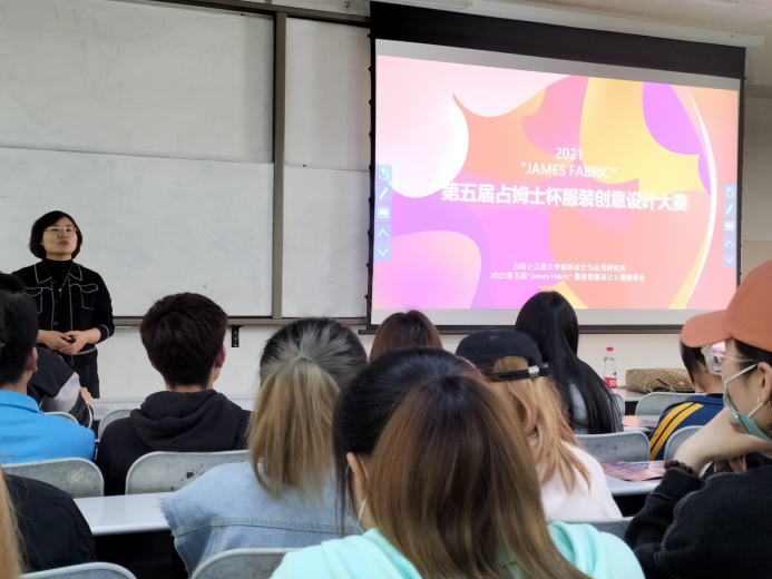 “James Fabric”杯纺织服装设计大赛已成功举办四届,搭建了以时装设计、时尚图案、企业对接等多领域交叉为特色的服装类专业赛事平台,江苏省非物质文化遗产研究基地——江南大学为此次比赛的承办单位。为帮助同学们更加了解比赛,邢乐老师为大家介绍了比赛的相关信息,展示了往届的优秀作品,详细讲解了第五届大赛的主题和参赛要求。第五届比赛聚焦以人工智能为代表的科学技术,以“拥抱未知”为主题,鼓励参赛者们大胆拥抱未知,拥抱对新事物的渴望,拥抱尖端潮流科技的热爱,以实现自然、科技、人文的创意性融合。讲座结束后,同学们主动询问老师关于大赛具体参加事宜,表达了对往届优秀作品的赞美,表示希望自己也能在比赛中学习锻炼,提升自身专业水平。