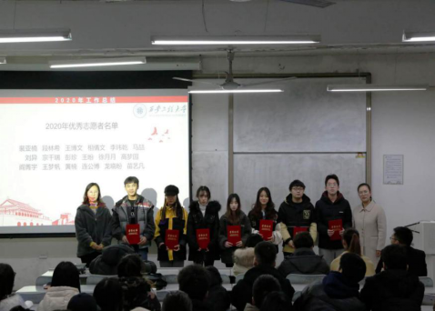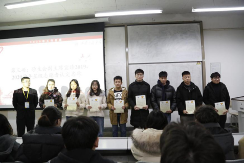 学生会副主席为2019—2020学年星级志愿者代表版发志愿服务认定证书。全体新生志愿者在青分队队长的带领下进行了入队宣誓。2020级辅导员王盼向新入队的注册志愿者分享了自己对志愿服务的理解,并对未来更好地开展志愿服务工作提出要求与期望。