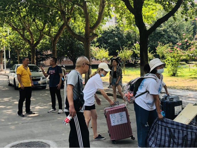 领导和辅导员老师的统一调度下,同学们有序地将行李往搬家车辆上装运,后分批乘坐校车前往金花校区。