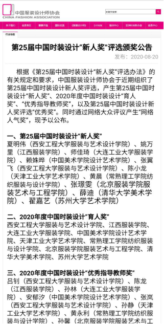 16级服装与服饰设计5班张翼飞、夏明伟获得新人奖,夏明伟同学获得第25届中国时装设计新人奖评选“网络人气奖”,吕钊教授、张岚老师获得2020年度中国时装设计“优秀指导教师奖”,黑料网
