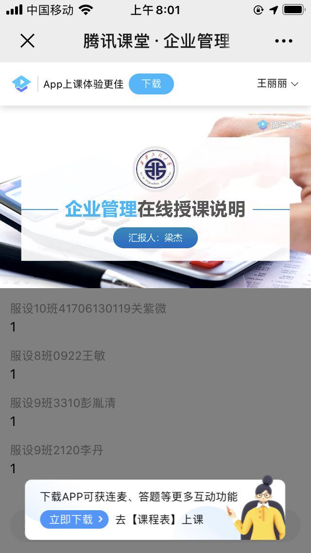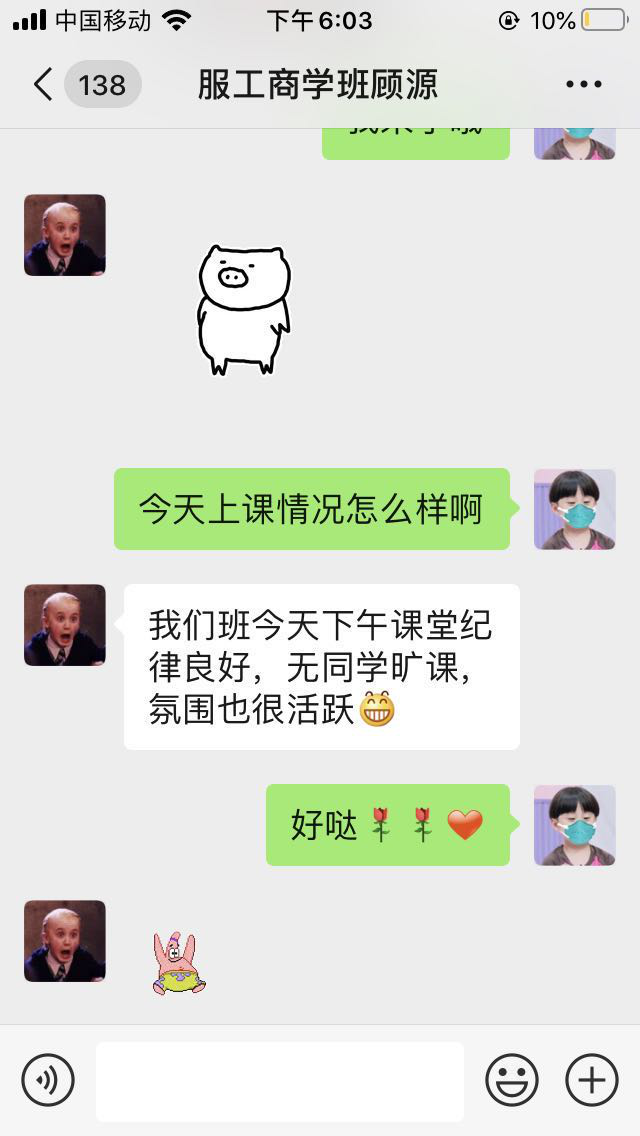 辅导员王丽丽询问17级服工商学班线上课程情况