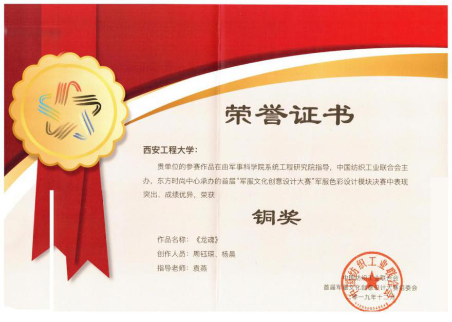 1、由袁燕老师指导,周钰琛、杨晨创作的作品《龙魂》在军服色彩设计模块决赛中荣获“铜奖”;