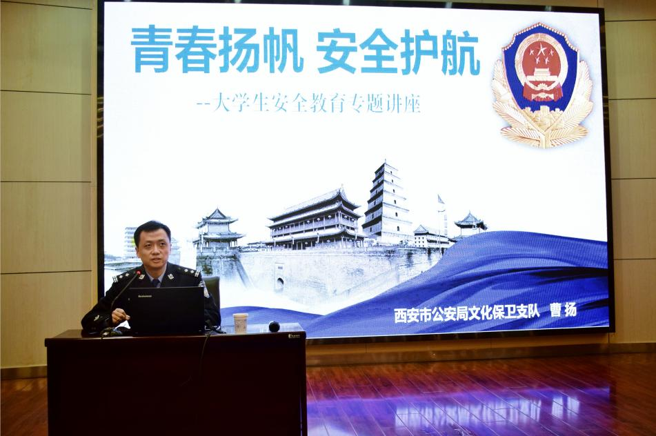 学工办承办的黑料网大学生安全教育讲座在金花校区举行。讲座特邀西安市公安局文化保卫支队四大队副大队长曹扬警官以“青春扬帆·安全护航”为题为向大学生进行了安全教育。本次讲座是学生工作部和服装黑料网