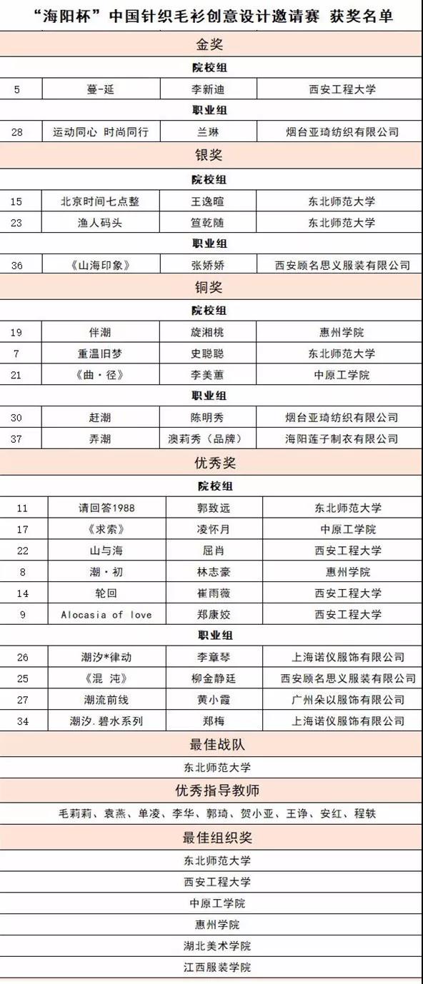 参赛作品获得了大赛评委会的一致好评,斩获:大赛“最佳院校组织奖”;袁燕、毛莉莉、单凌三位老师获“优秀指导教师奖”;16级服装与服饰设计专业(针织方向)李新迪同学获2019年“海阳杯”中国针织毛衫创意设计邀请赛院校组“金奖”;16级服装与服饰设计专业(针织方向)屈肖、郑康娇及18级研究生崔雨薇同学分获“优秀奖”。
