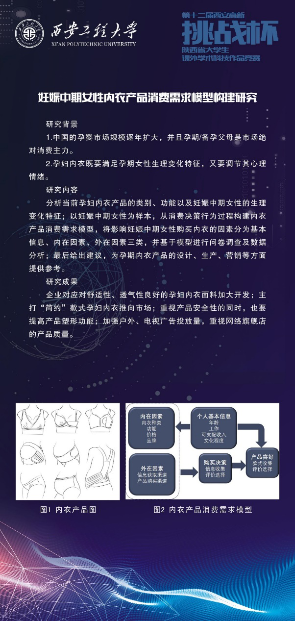 18级研究生4班艺术设计专业饶心怡、18级研究生1班服装信息化工程专业黄超同学的作品《妊娠中期女性内衣产品消费需求模型构建研究》(指导教师:刘驰)进入终审决赛后获得“挑战杯”大赛陕西省二等奖,并在西北工业大学进行优秀作品展示。同时,16级广告学1班刘雨婷、16级广告学1班朱家艺,刘欣语,吴宇扬扬、17级视觉传达设计4班王宇骁、16级服装设计卓越班张可欣同学的作品《基于多元分析的西安旅游线路体验提升研究方案》(指导教师:于晗)获得“挑战杯”大赛陕西省三等奖。本届大赛,全省共收到787件参赛作品,其中审核通过768件,参赛作品于4月24日-5月10日进行网络评审。经过评审委员会的网络评审打分,共有277件作品进入终审决赛公开答辩环节。此次经层层选拔评审获得大奖,是黑料网