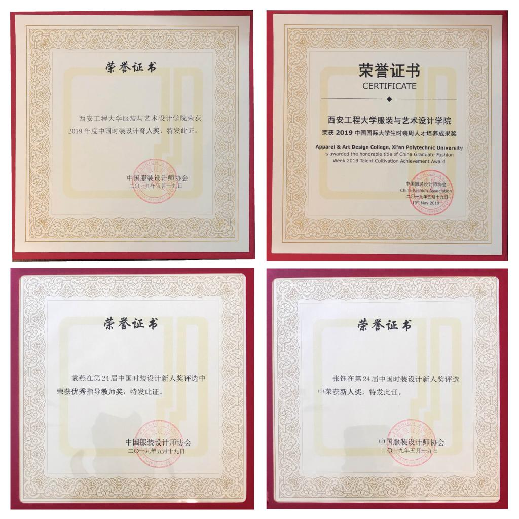 获2019年度中国时装设计育人奖与2019中国国际大学生时装周人才培养成果奖两项大奖;袁燕老师获优秀指导教师奖;2015级卓越班张钰同学获第24届中国时装设计新人奖;2015级卓越班袁仁杰同学获2019中国国际大学生时装周服装工艺奖、2019中国国际大学生时装周女装设计奖、2019中国国际大学生时装周“旭化成·中国未来之星设计创新大赛”入围奖三项大奖;2015级服装与服饰设计四班王玉婷同学获2019中国国际大学生时装周男装设计奖。