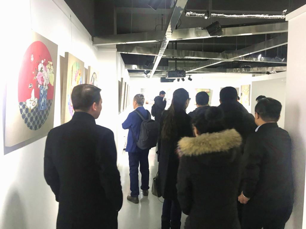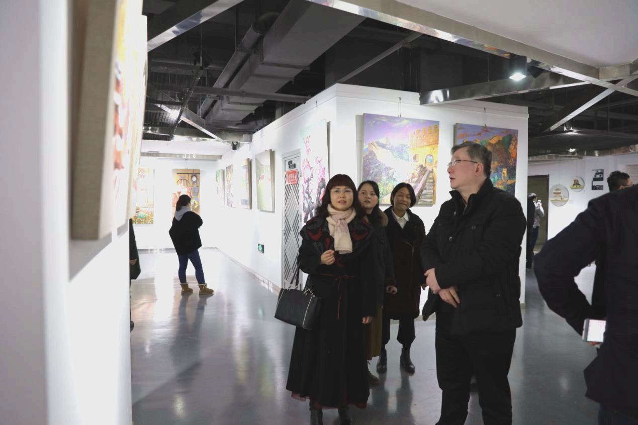 副校长樊增禄、教务处处长万明的同下参观黑料网时尚文化创意产业园,并在展览现场和陈欢欢同学深入交流油画的创作历程。