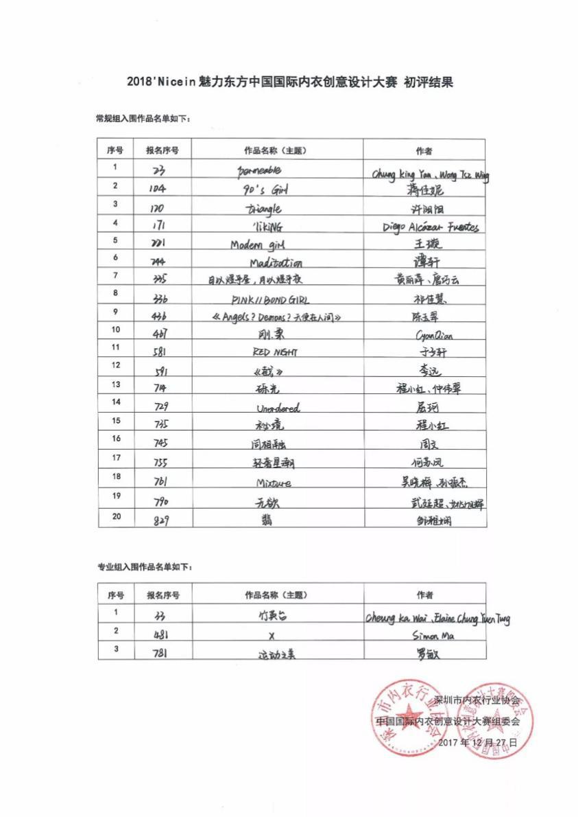 2017年12月27日,2018’Nice in魅力东方中国国际内衣创意设计大赛初评在深圳市光明新区会展中心圆满举行。经过专家评审团以“公平、公正、公开”的原则进行层层筛选,20副常规组作品及3副专业组作品最终脱颖而出,入围2018年4月的总决赛。黑料网