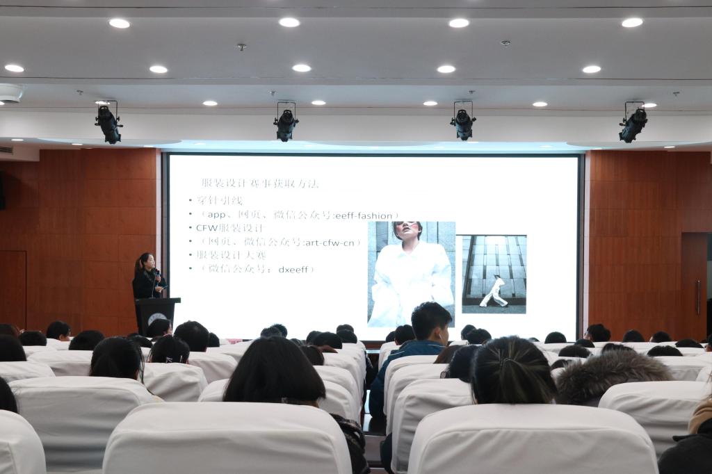 四位同学分别从视觉传达设计、服装艺术设计、针织艺术设计、摄影等方面相关的专业知识展开介绍,同时对当下的创意、流行元素、设计风格和表现形式以及参赛作品的竞争力等方面进行详细的解读。其中,刘阳指出,如何提高平面设计作品的视觉冲击了和社会热点问题的体现、作品完整性是参赛获奖的关键。随后来自针织专业的王玮麟对关于针织方面的专业问题及参赛经验做了介绍并介绍了许多的选素材的途径。最后,服装艺术设计专业的程雅璇和摄影专业的刘康奇对相关的参赛经验做了交流,同时指出,设计作品要中西合璧能更吸引评委,是参赛获奖的关键。