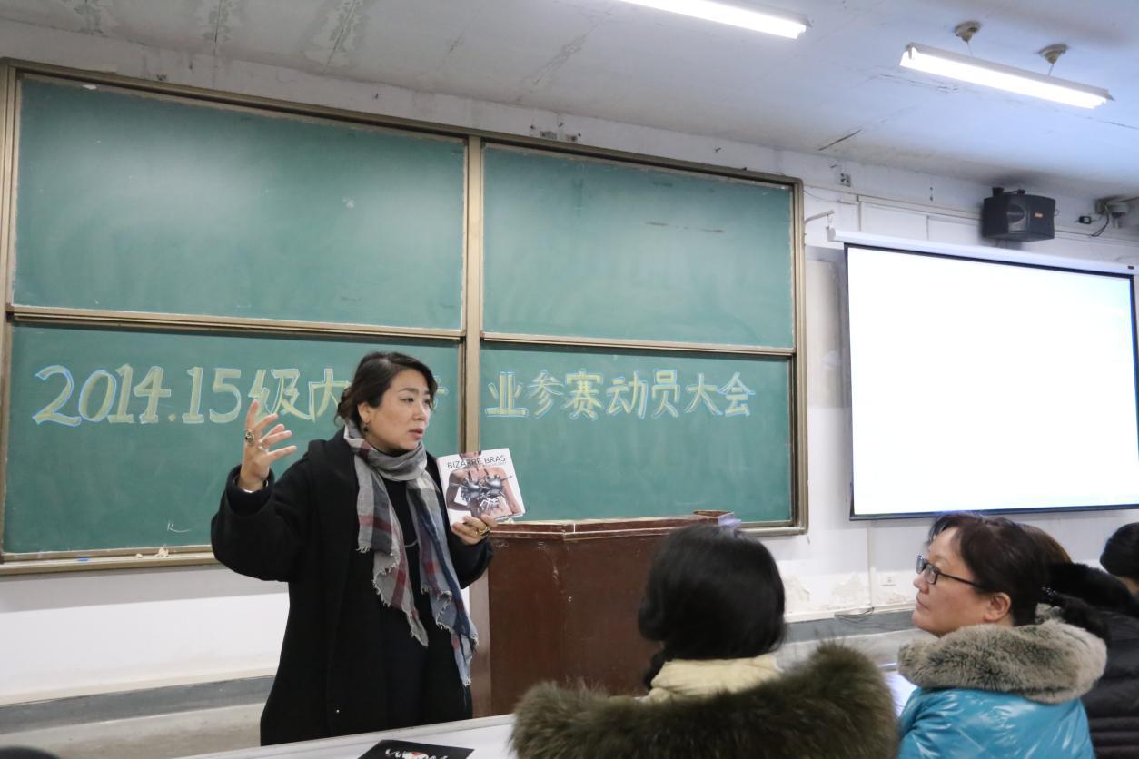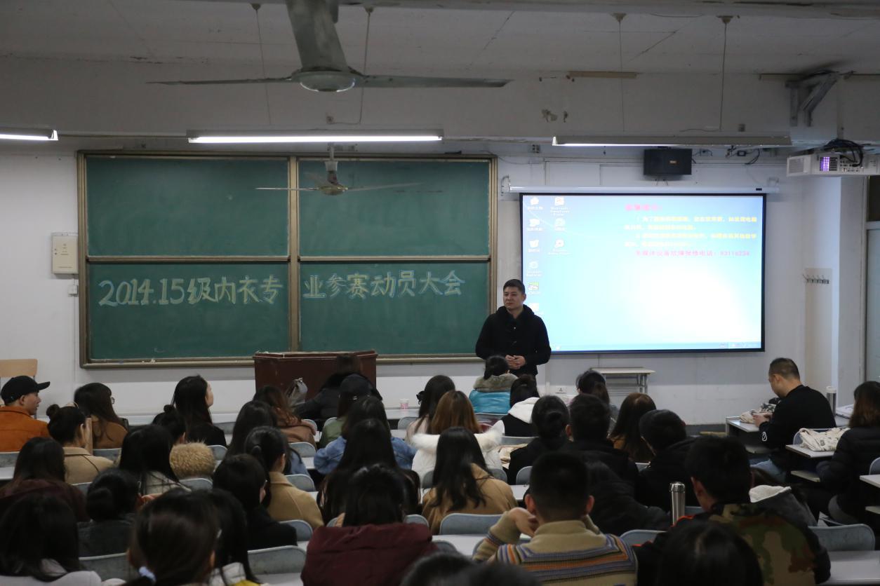领导的高度重视,吕钊副院长,田宝华副院长和服装设计系主任袁燕老师亲临会议现场并做了重要讲话,2014和2015级内衣班学生及指导此次毕业设计大赛的八位老师,即内衣系刘驰、周捷、胡茗、王玉娟老师、服装设计系田宝华、袁燕、刘静、陈彬等老师参加了此次动员大会。大会由内衣系主任刘驰老师主持。