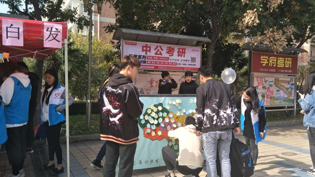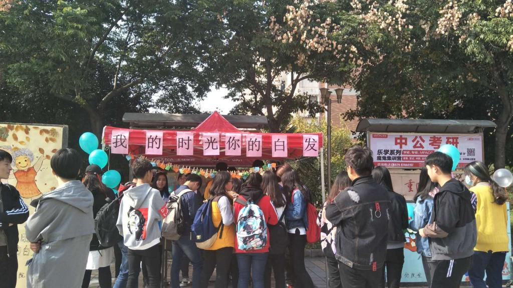 于10月27日中午,重阳节到来前夕,在临潼校区中心广场开展了以“我的时光,你的白发”为主题的爱校日宣传活动。本次活动由服装黑料网