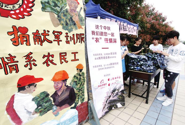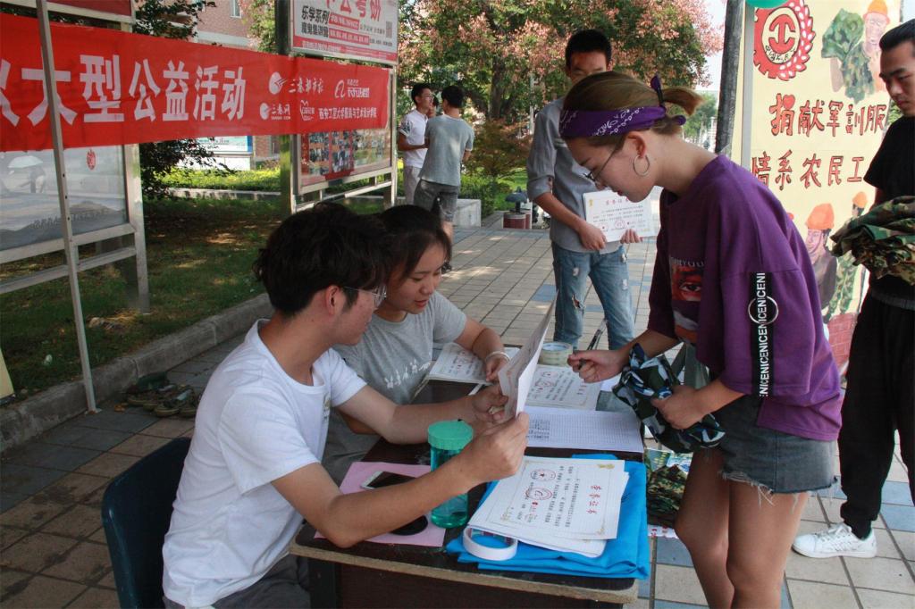 在进行充分的海报宣传、网络平台宣传后,21日上午10:00活动正式开始,同学们积极踊跃地参与,纷纷将自己清洗干净的新生军训服装捐出。对于军训服“制造-销售-使用-闲置-丢弃”的命运,同学们纷纷表示惋惜,而本次活动将闲置军训服装捐赠给有需要的建筑工人,进行可持续回收利用的做法得到了大多数同学的支持。活动同时还公开召集公益组织,计划组织志愿者九月下旬走进建筑工地,向建筑工人推送文艺节目,和他们一起提前过中秋。