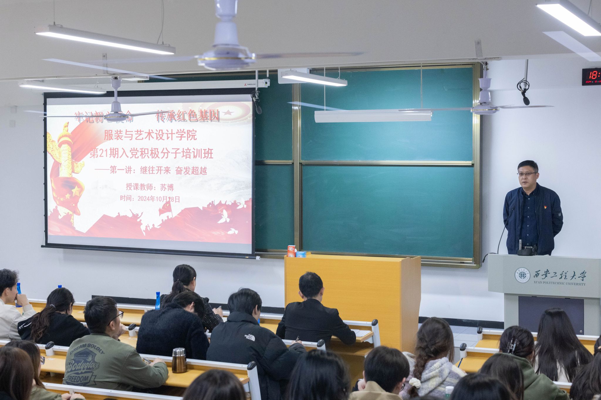 随后,苏博以“中国共产党为什么能”为主线,为21期入党积极分子讲授了一堂生动的党课。在课程中,苏博总结和阐述了党的百年奋斗的辉煌成就,以生动的史实案例,与全体学员一起探讨为什么中国共产党能够领导中国人民创造无与伦比的“中国奇迹”,引导全体学员深入理解中国共产党的力量源泉和初心与使命。要求全体同学务必了解并在生活中贯彻党的宗旨,不忘全心全意为人民服务的宗旨,坚定理想信念,听党话跟党走,勇于奉献,积极担当,做新时代最美大学生。