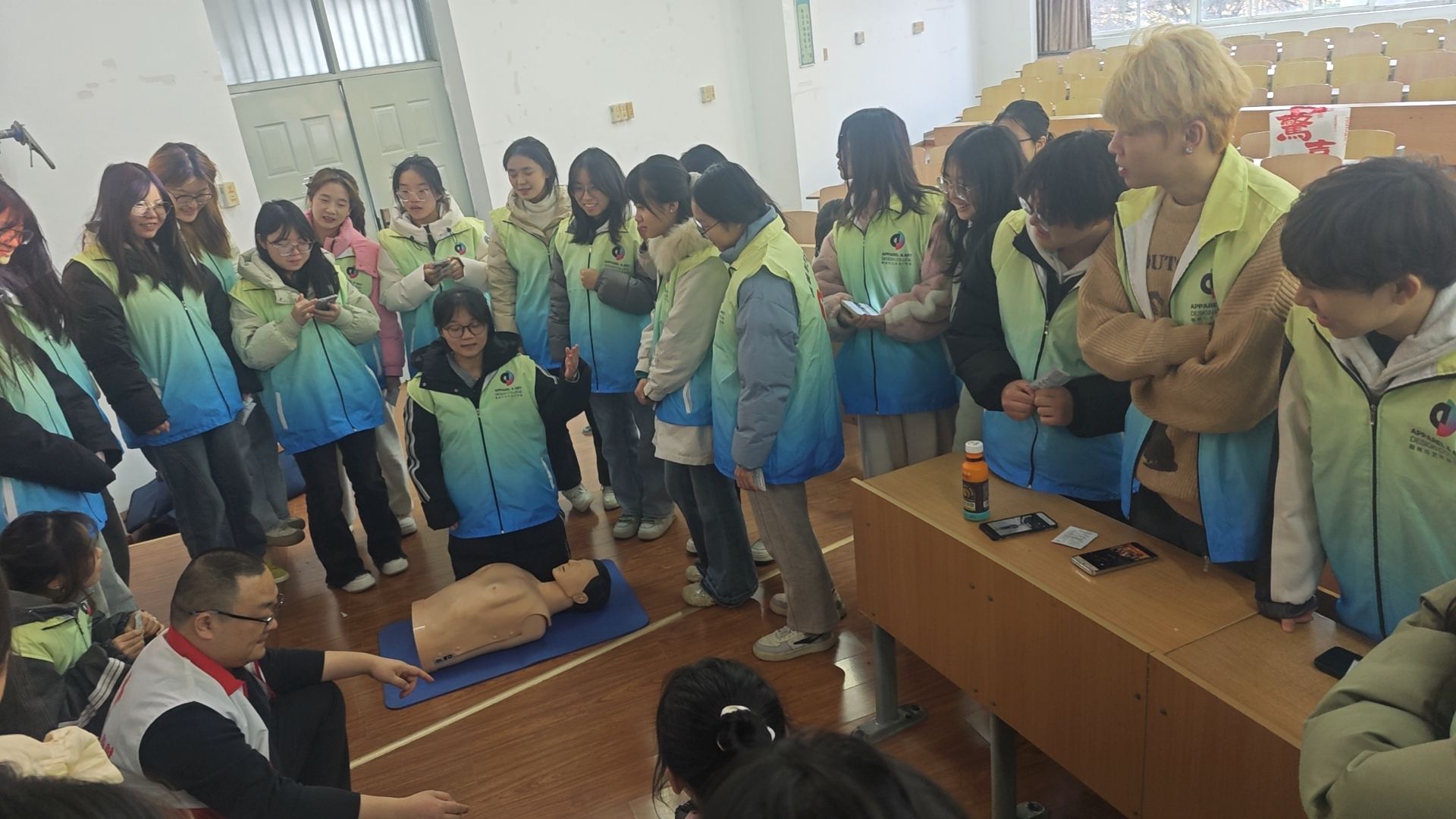 实操教学环节,宋世君将模拟人及急救设备置于讲台,示范心肺复苏标准动作。实操演示激起同学们上手尝试的热情,大家分组在模拟人旁依次练习,在多方协助下,同学们逐渐掌握技巧,按压动作愈发标准。历经四小时培训,所有学员顺利通过考核,掌握了基础急救技能。