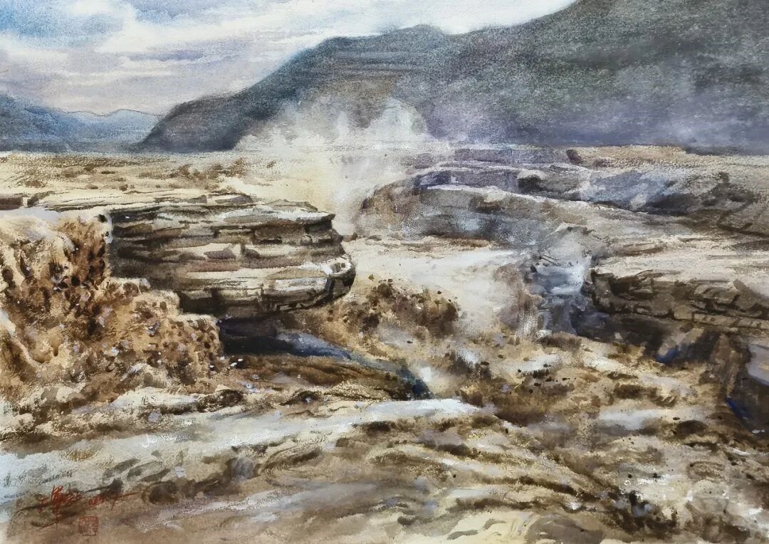 樊军让《奔腾吧黄河》水彩 55X75cm