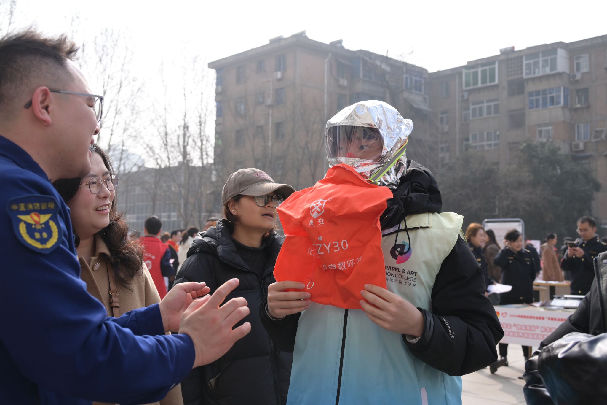 (社区群众和志愿者学习如何使用防烟面罩)