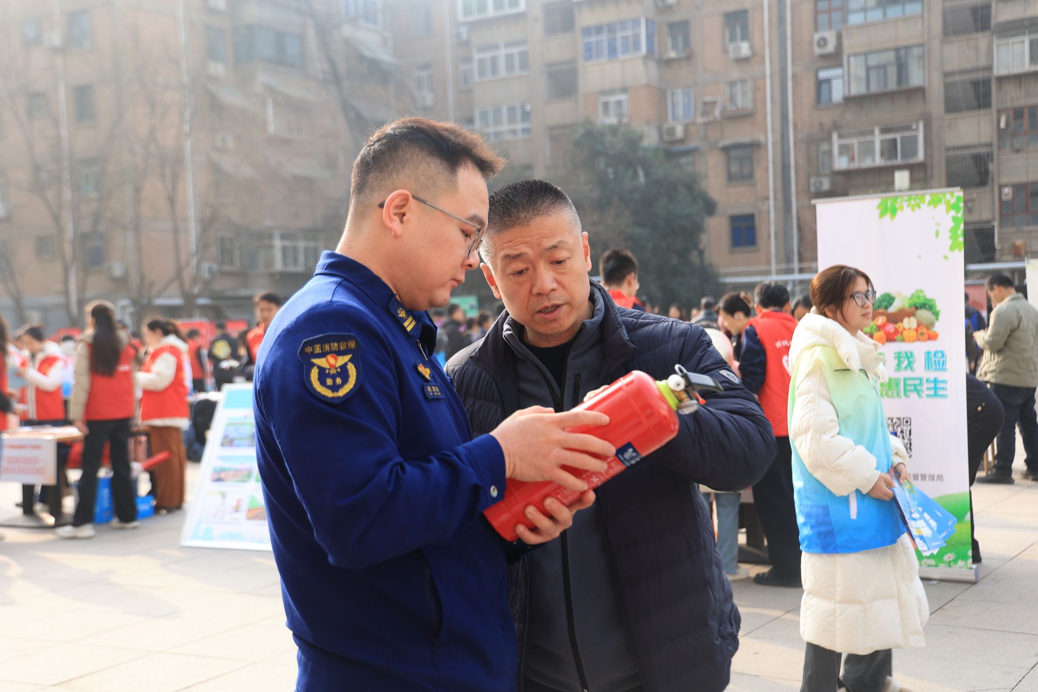 (消防员魏万胜向居民讲解消防器材使用方法)
