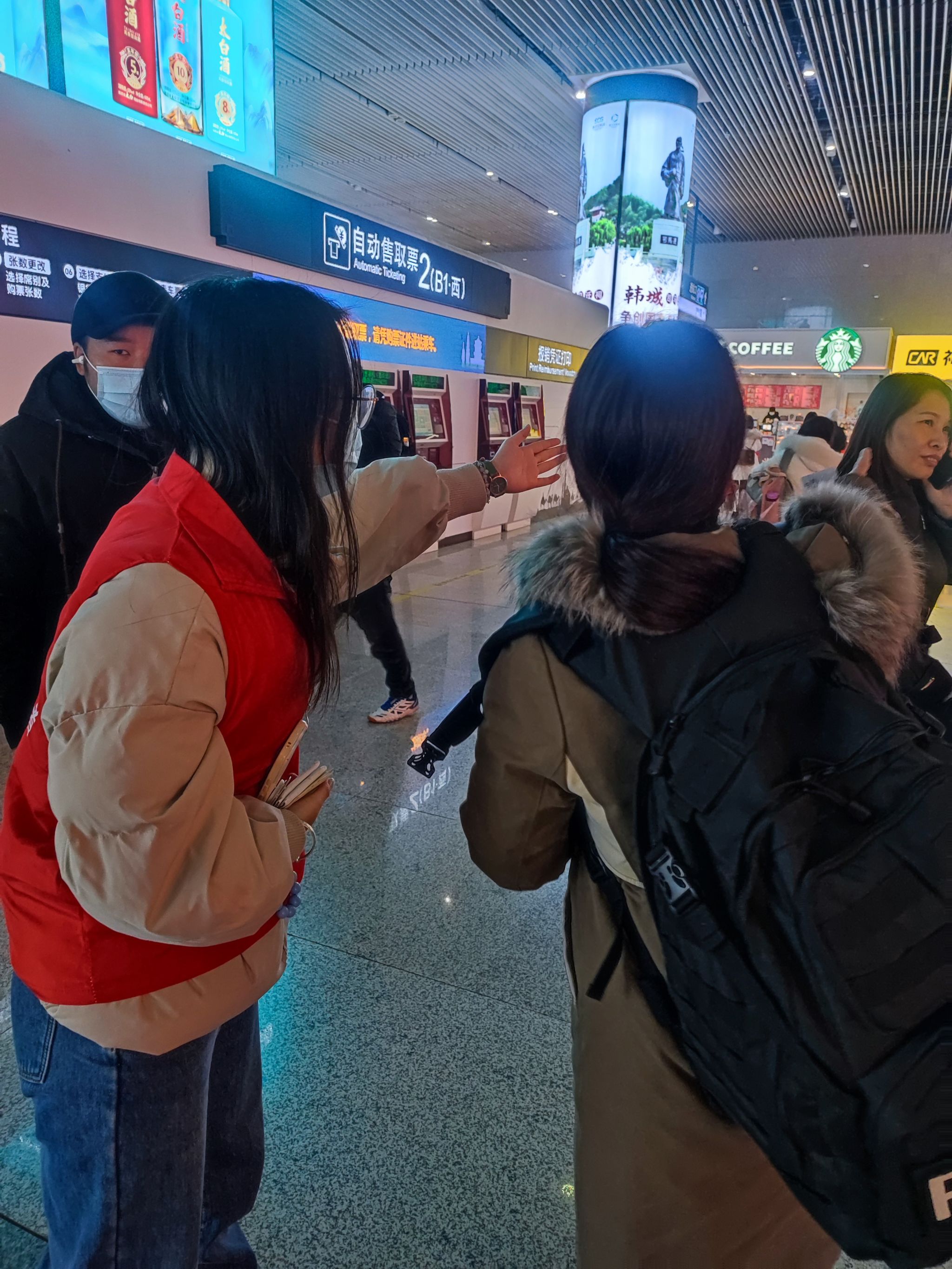 各地在活动开展前均对志愿者进行了专业培训,内容涵盖春运客流引导、应急救护、重点旅客帮扶等。活动启动后,志愿者们奔赴各站点,在安检口、候车厅、售票处等区域,为旅客提供引导咨询、秩序维护、行李搬运等便民服务。24级设计学类16班龙甜甜、24级设计12班张语娜负责指引工作,化身“活地图”,为旅客提供准确的指引,确保旅客能够快速找到进站口、售票厅、卫生间等关键地点。针对特殊群体,志愿者们开通“绿色通道”,一对一协助购票、进站。