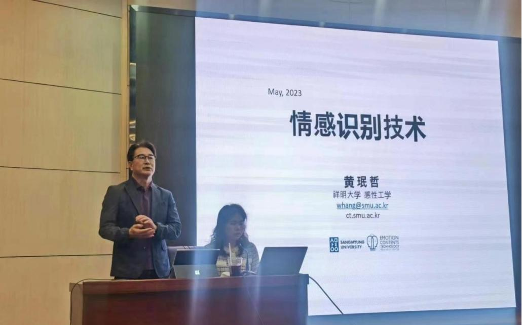院长黄珉哲教授就情感属性和情感识别技术等内容进行了两个小时的专题分享。黄珉哲教授博士毕业于生物医学工程专业,毕业后一直致力于情感识别技术的开发和应用研究,期间创建了感性工学学科,emotion lab工作室,发表情感认知技术SCI论文153篇,出版专著4部,获得技术开发专利数十项。情感认知技术是一门综合计算机科学、设计、医学、心理学、医学工程等多学科的交叉领域,黄珉哲教授以自身多年的研究为依托,生动细致地解读了“情感认知技术”这一主题,报告内容以情感在沟通中的重要性、情感的分类、情感产生的生理变化和情感识别技术四个角度为切入点,由浅入深,由现象到本质,将情感识别技术的重要性和时代性,做了详细的讲解,同时提出情感技术现在和将来可能发展的四个方向,一是将变革以人类体验为中心的行业和人类机能环境;二是模拟感性数字化的标准化是科学化的前提;三是认知科学和人文学科的一致性至关重要;四是融合技术是创造新价值的关键技术。此后,结合情感认知技术基础理论,对研究室成果转化项目也做了简单的介绍,其技术成果得到了老师和同学们的一致认可。
