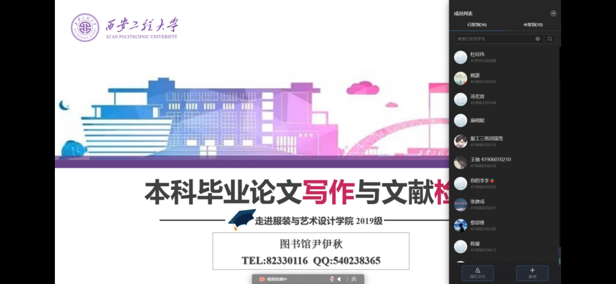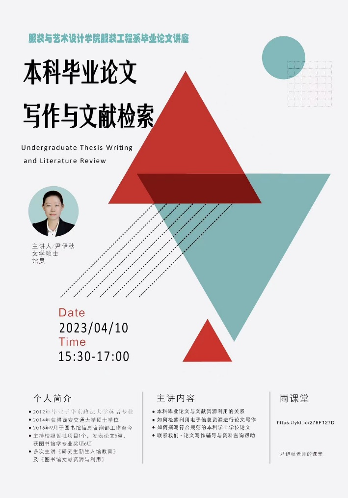服装工程系于2023年4月10日下午通过雨课堂在线举行了《本科毕业论文写作与文献检索》讲座,邀请了图书馆的尹伊秋老师为同学们讲解了本科毕业论文与文献资源利用的关系、如何检索利用电子信息资源进行论文写作以及如何撰写符合规范的本科学士学位论文等内容。服装设计与工程专业2023届全体毕业生参加了此次讲座。