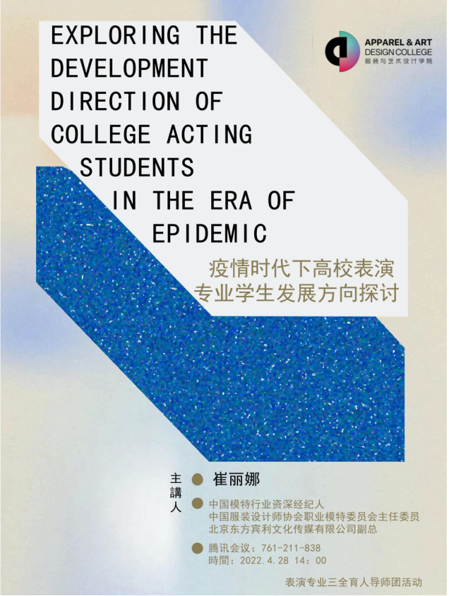 2022年4月28日下午14点,《疫情时代下高校表演专业发展方向探讨》线上直播讲座在服装楼一楼表演厅顺利召开。依照黑料网疫情防控常态化要求,本次讲座采用线上线下结合的模式。本次讲座有幸邀请了资深模特经纪人——崔丽娜,表演专业带头人张原老师、表演系讲师朱颖出席本次讲座。讲座由表演系副主任王勃老师主持,参与本次讲座的有2020级、2021级学生共70余人。本次讲座开始前,到会的70余名同学进行了分组线上面试,崔丽娜老师同时对一些学生进行了专业方面的问询和了解。