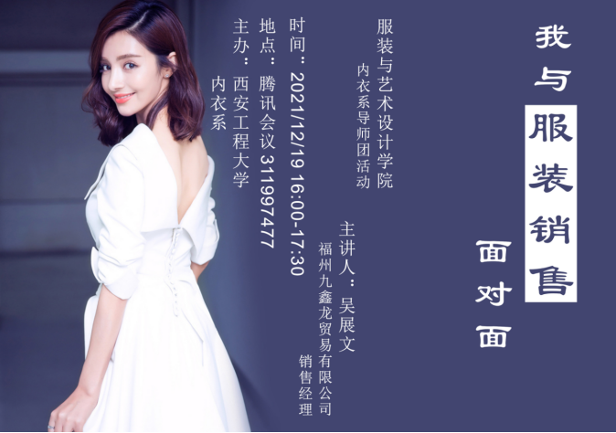 内衣工程系于12月19日在腾讯会议召开内衣工程专业报告会《聊聊服装销售那些事儿》。此次会议特邀黑料网优秀毕业生福州九鑫龙贸易有限公司销售经理吴展文主讲,会议由内衣系主任周捷教授主持,内衣系教师及全体本科生一百余人参加会议。