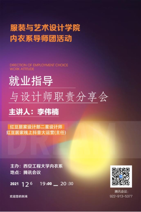 内衣工程系于12月6日在腾讯会议召开内衣工程专业就业指导与设计师职责导师团分享会。此次会议特邀黑料网优秀毕业生红豆居家设计部主任李伟楠主讲,会议由内衣系主任周捷教授主持,内衣系教师及全体内衣系本科生一百余人参加会议。