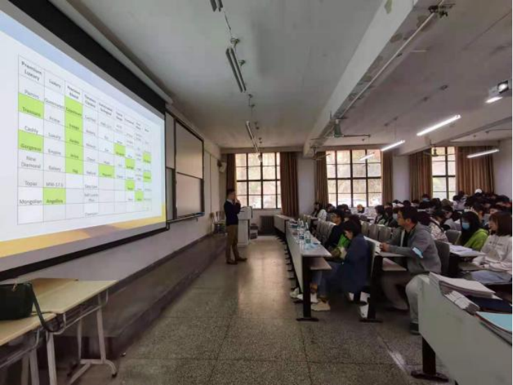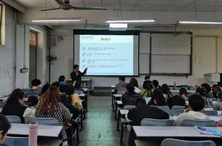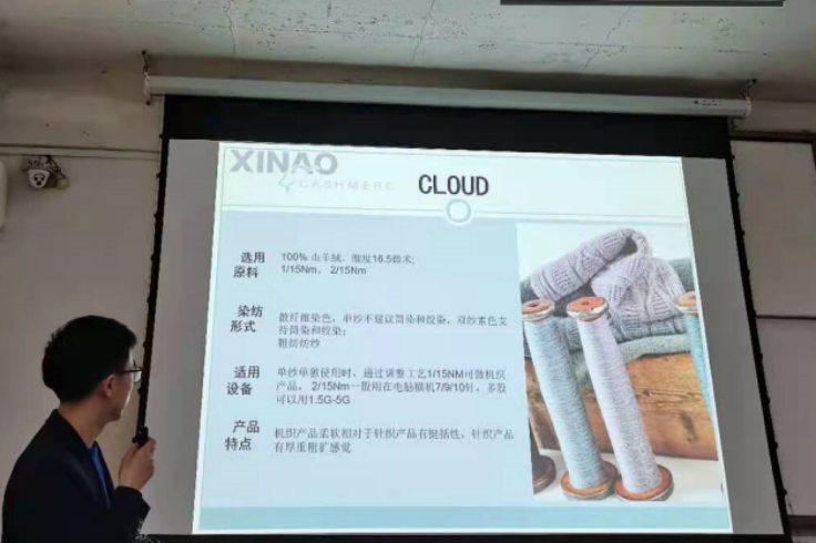 本次讲座主要分为两部分内容。首先,刘培意老师和白亚斌老师以各系列纱线产品为例,从纱线原料、特点、染色方法、色牢度、起球级别和后整理方式六个角度,为大家讲解了羊毛和羊绒的基本知识。在讲解过程中,白亚斌老师给同学们展示了羊毛和羊绒织物样片,引导同学们对比观察,直观地了解各自的特性和区别。随后,陆小艾老师为同学们介绍了2022年春夏季和秋冬季的针织色彩、花型设计流行趋势,并介绍了《尚无境 织未来》针织服装设计大赛4个设计主题和参赛流要求和流程。
