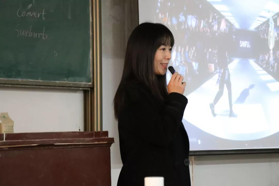 接着陕西区域经理余敏女士以三福时尚2020年春夏时装发布会秀场视频作为引入,讲述了服装行业当下及未来的流行趋势。她以大量的流行元素在服装中的实际应用图片进行详细讲解,让同学们对男装、女装以及内衣行业的流行元素、流行色系有了充分认知。余敏女士还向同学们介绍了各大品牌在消费转型的大背景下,推出的国潮元素、运动风潮、IP联名等现象,进一步分析服装流行趋势的发展。