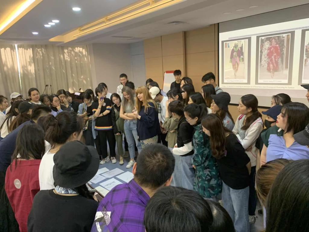 而后,Ana教授结合优秀时尚插画范例细心讲解,并组织在场同学展开了有趣的激发潜能绘画练习。她要求学生无需按照指定的规则、示意图或严格的指示来作画,而是要求同学们分解时尚插画的一些关键元素,例如线条、比例、拼 贴、剪影等,同时结合双手作画、连续线条作画等逆向练习扩展视野、发掘个人长处。现场循序渐进的练习和作品讲评、问答互动,大大激发了在场学生的学习热情与创意灵感。